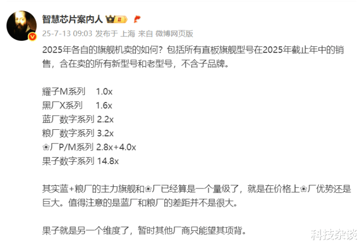 于是在7月13日行业人士“智慧芯片案内人”就提供了一份主流六大品牌各自旗舰上半年的销量对比,大家要注意这个销量数据是包括所有直板旗舰型号在2025年截止年中的销售,含在卖的所有新型号和老型号,不含子品牌。他是以荣耀的Magic系列为基数的,也就是荣耀Magic系列的销量1.0X,OPPO Find X系列的销量为1.6X,vivo X数字系列的销量为2.2X,小米数字系列的销量为3.2X,华为Pura系列+Mate系列的销量为6.8X,其中Pura系列为2.8X,Mate系列的销量为4.0X。苹果数字的销量为14.8X。